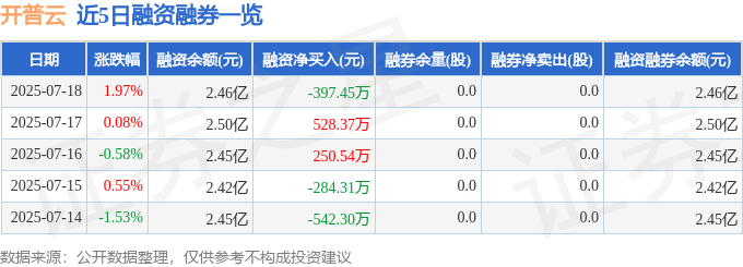 开普云融资融券信息显示,融资方面,当日融资买入3113.45万元,融资偿还3510.9万元,融资净偿还397.45万元。融券方面,融券卖出0.0股,融券偿还0.0股,融券余量0.0股,融券余额0.0万元。融资融券余额2.46亿元。